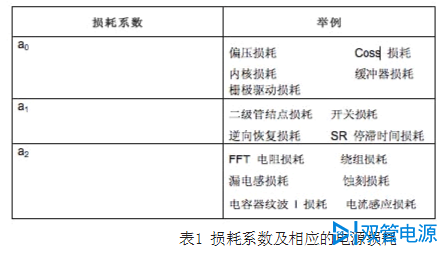 表1概括总结了各种电源损耗项及其相关损耗系数,该表提供了一些最佳化电源效率方面的折中方法。例如,功率MOSFET导通电阻的选择会影响其栅极驱动要求及Coss损耗和潜在的缓冲器损耗。低导通电阻意味着,栅极驱动、Coss和缓冲器损耗逆向增加。因此,您可通过选择MOSFET来控制a0和a2。